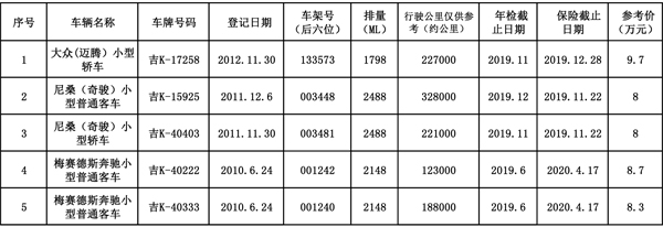 吉林省天池拍賣有限責(zé)任公司受長(zhǎng)白山旅游股份有限公司的委托,對(duì)以下5臺(tái)公務(wù)用車進(jìn)行公開拍賣: